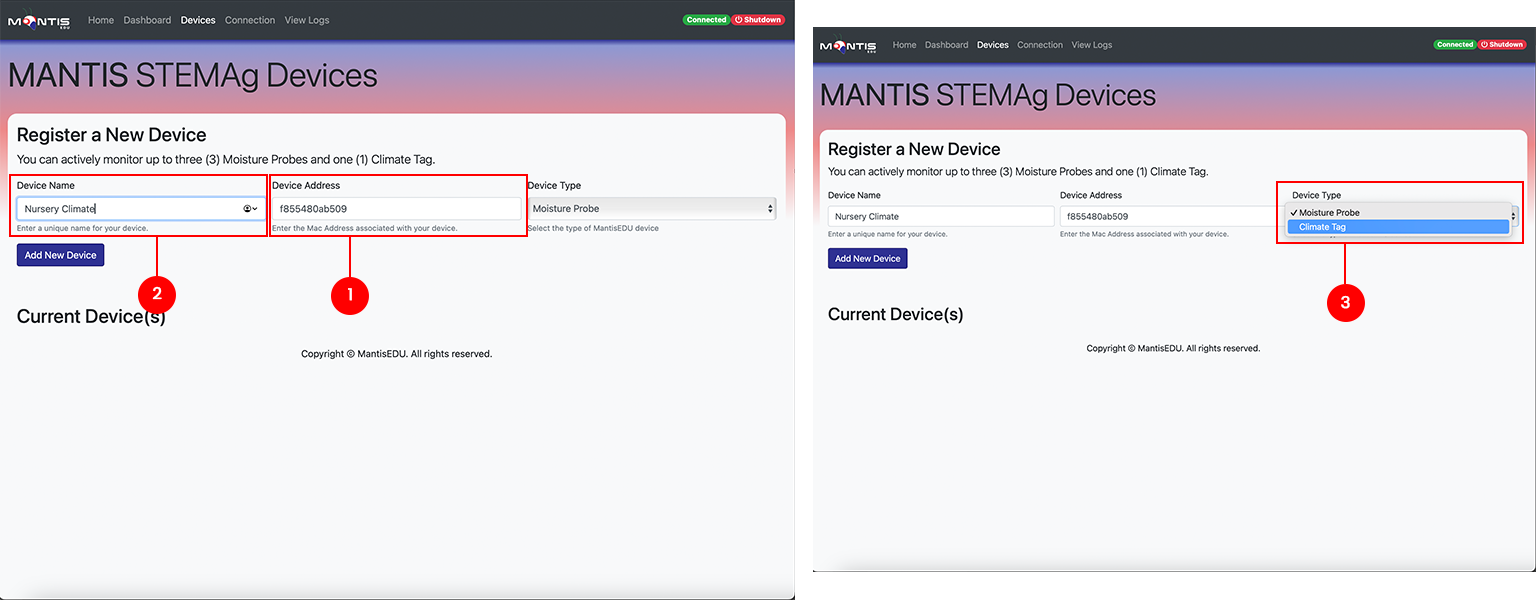This guide will walk you through registering a new ClimateTag Device in the Mantis STEMAg web app.