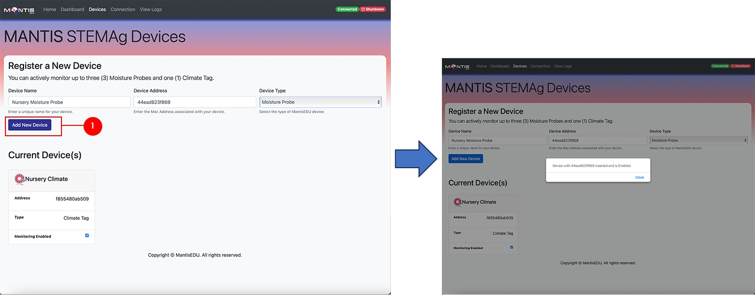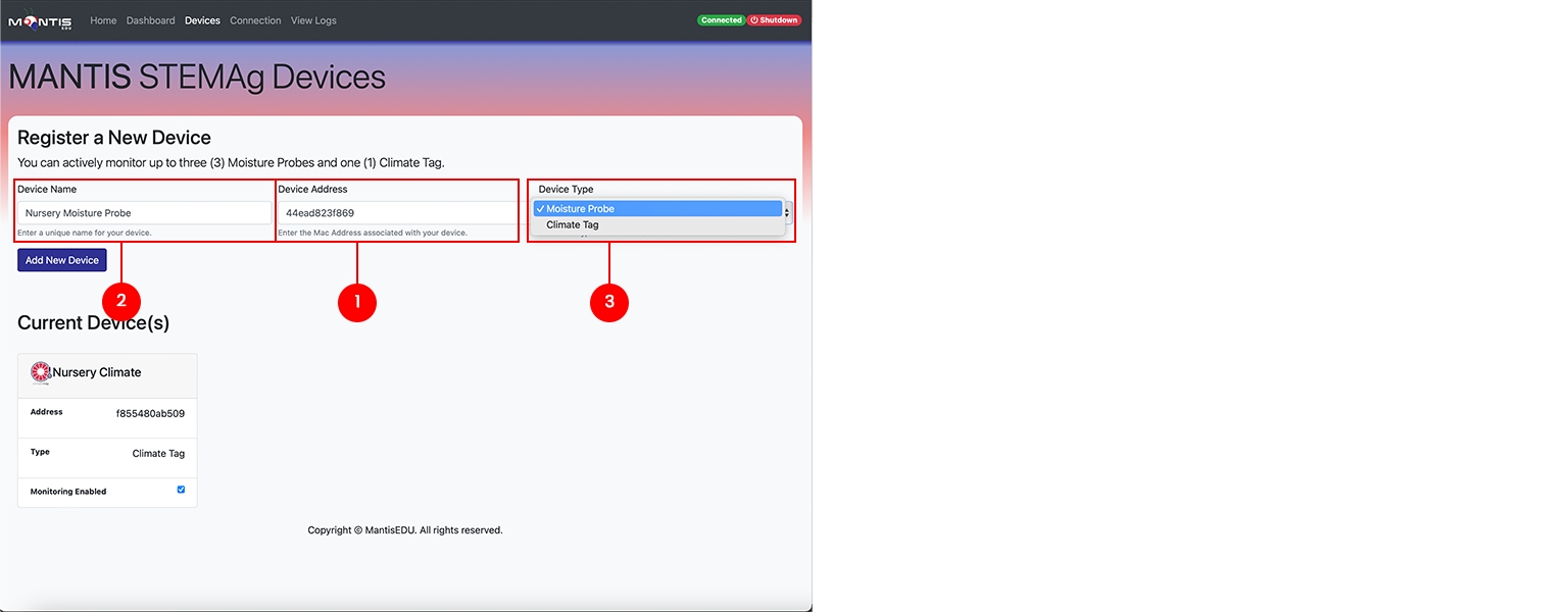 This guide will walk you through registering a new ClimateTag Device in the Mantis STEMAg web app.