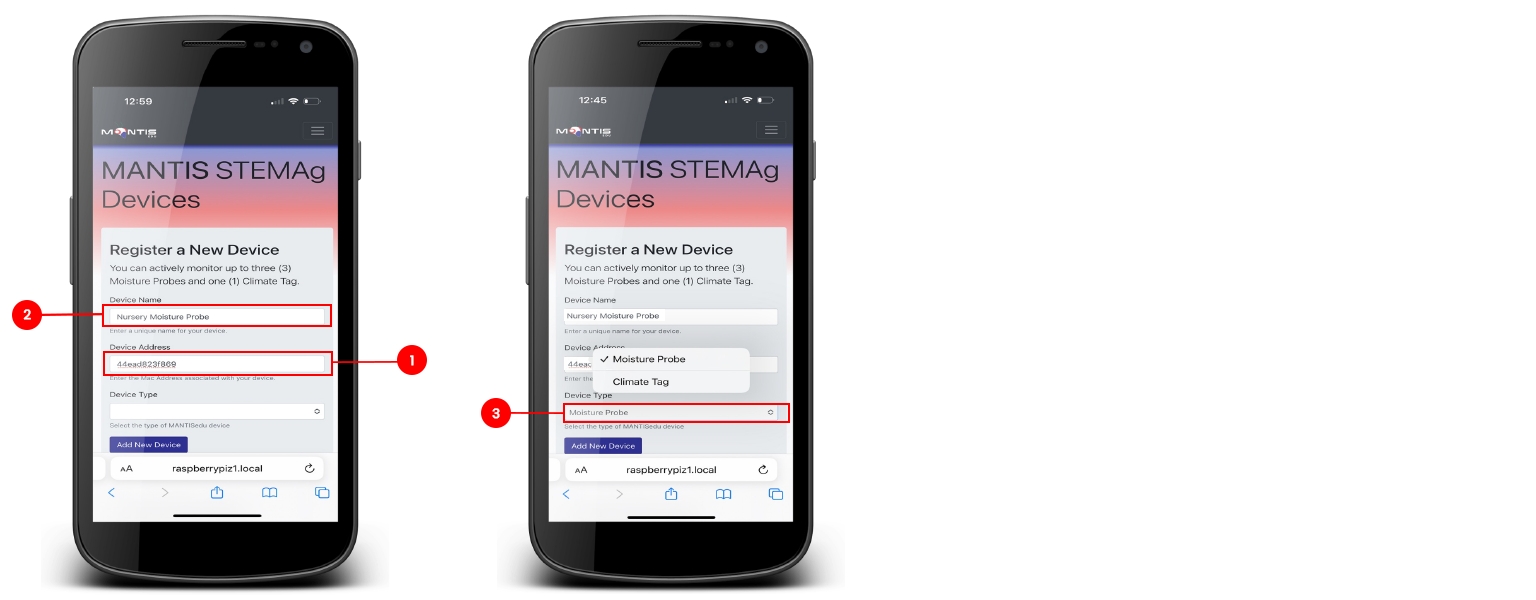 Enter the MAC ID displayed in the MantisEDU app for the Moisture Probe in the device address field on the Devices screen.